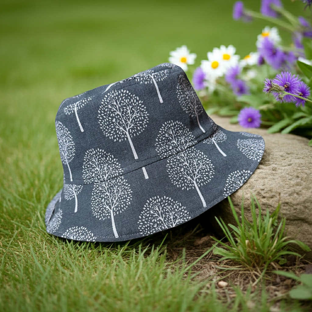 Discover versatile style with our handmade bucket hat. Featuring intricate tree pattern on a natural linen fabric, this reversible hat combines traditional craftsmanship with modern flair. Perfect for adding a unique touch to any outfit.