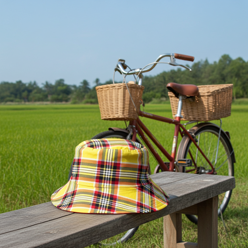 Discover versatile style with our handmade bucket hat. Featuring intricate pelikat pattern on one side and a random plain color on the reverse, this reversible hat combines traditional craftsmanship with modern flair. Perfect for adding a unique touch to any outfit.