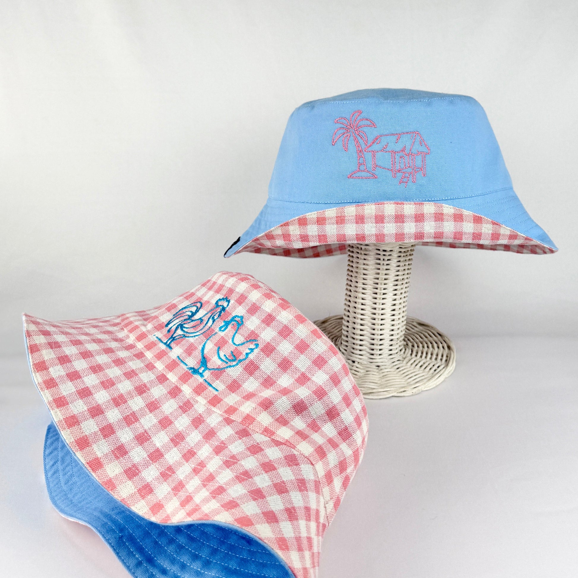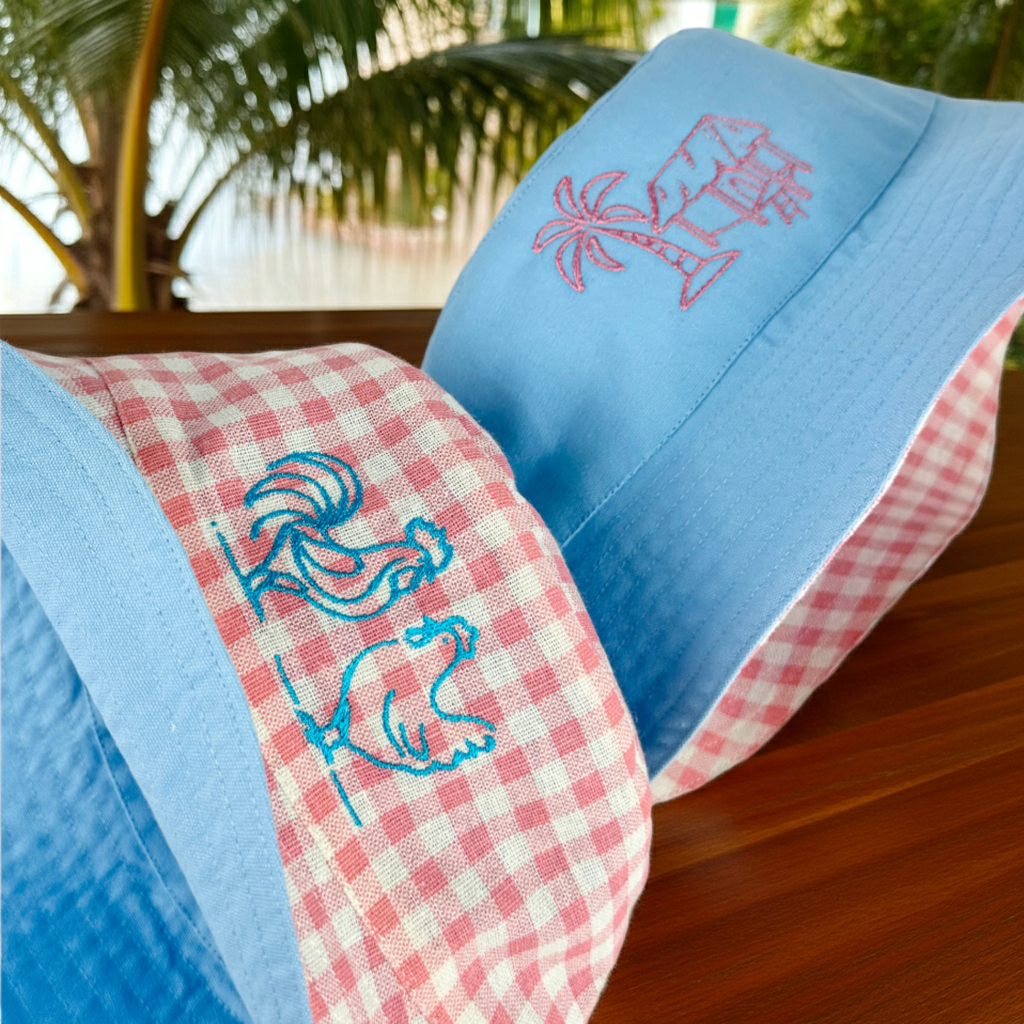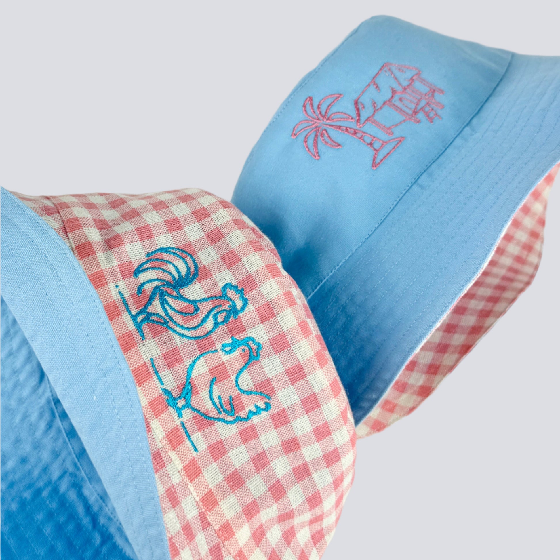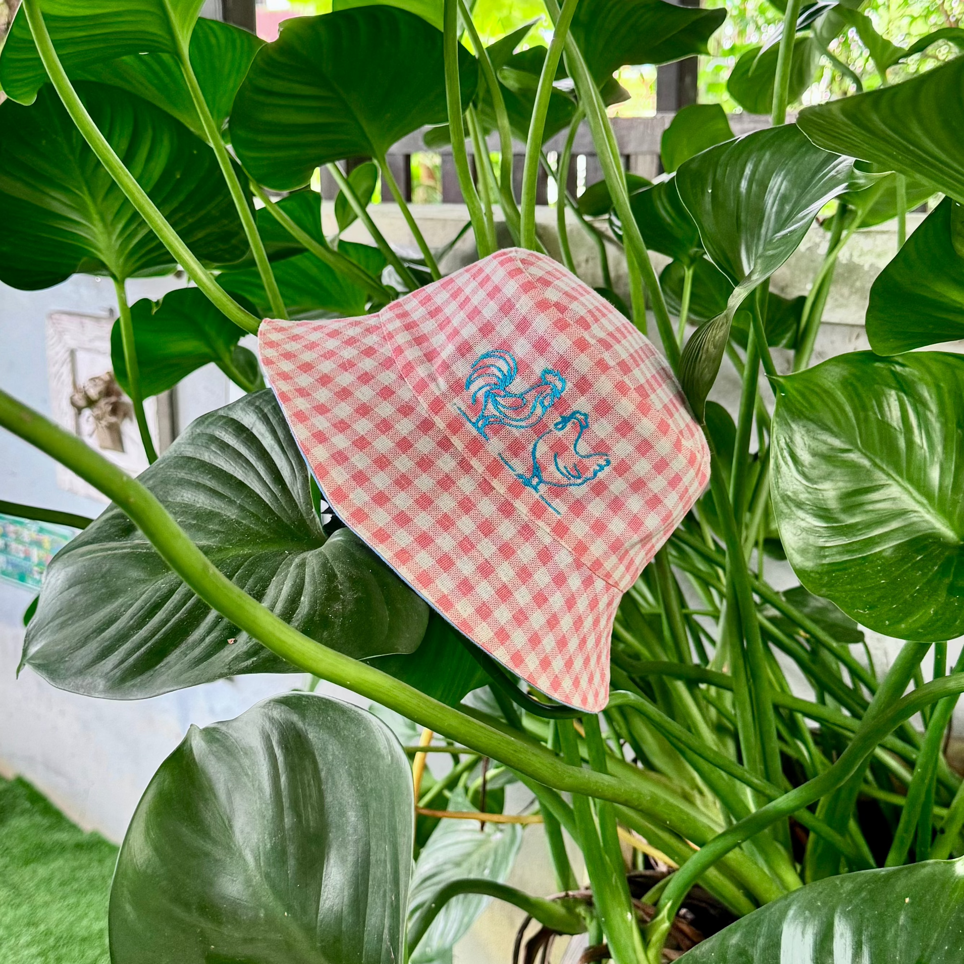 ✔ Side 1 : Pink gingham with Ayam Kampung embroidery – a nod to the iconic kampung wake-up call.