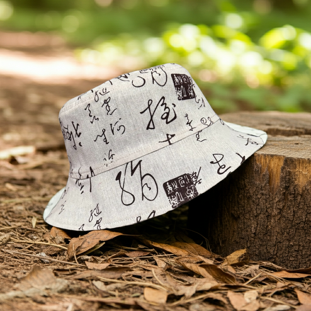 Discover versatile style with our handmade bucket hat. Featuring intricate caligraphy pattern on a natural linen fabric, this reversible hat combines traditional craftsmanship with modern flair. Perfect for adding a unique touch to any outfit.